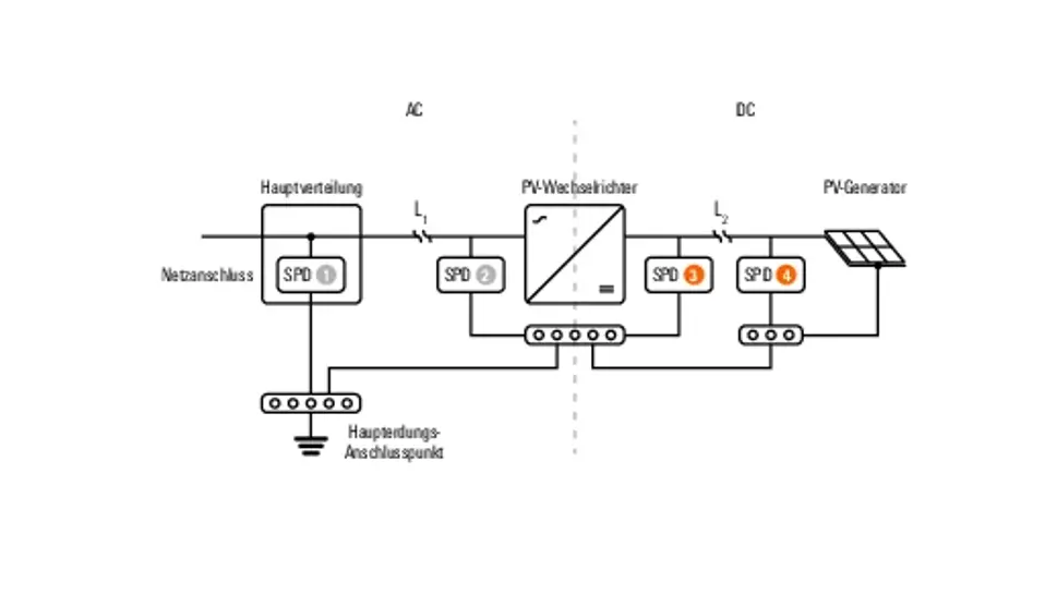 L1 beschreibt hierbei die Leitungslänge zwischen Hauptverteilung und PV-Wechselrichter (AC-seitig) und L2 beschreibt die Leitungslänge zwischen PV-Wechselrichter und PV-Generator (DC-seitig). Bei einer Leitungslänge > 10 m wird normativ auf beiden Seiten ein SPD gefordert.