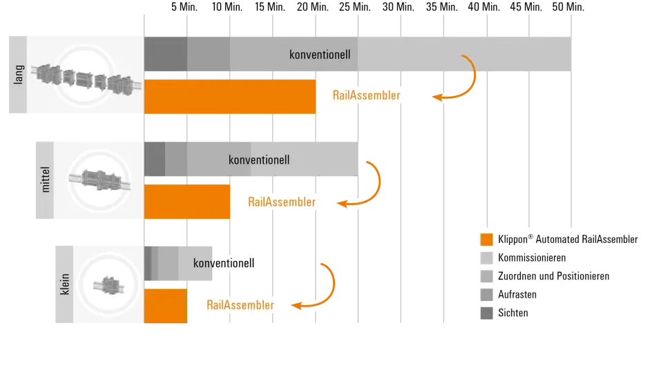 Der Klippon® Automated RailAssembler bietet erhebliches Optimierungspotenzial. Er ermöglicht Ihnen eine um bis zu 60 % schnellere Bestückung bei 100%iger Planungssicherheit.