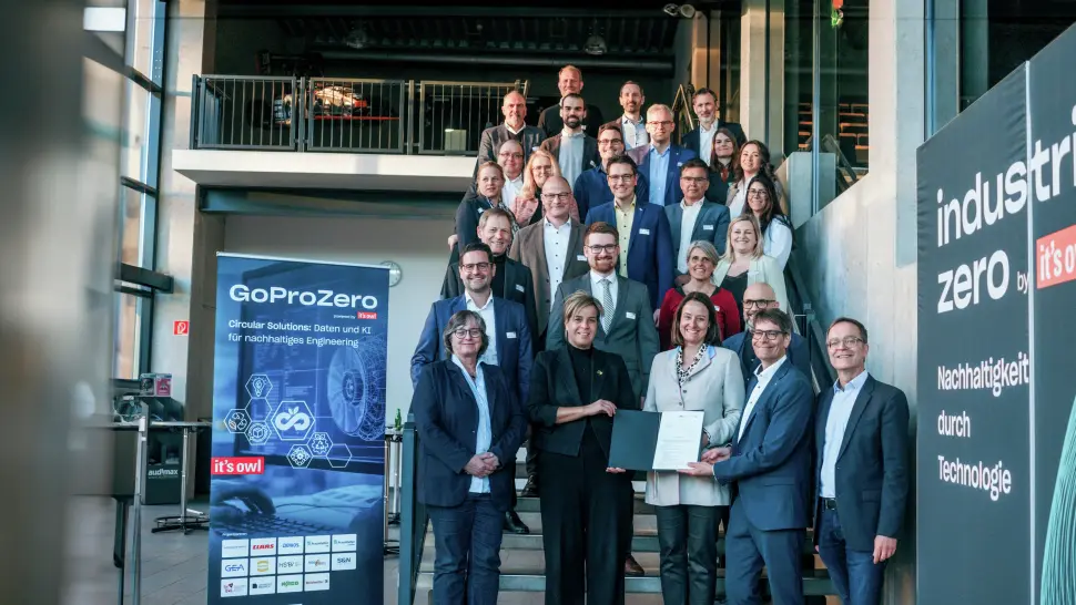 Weidmüller beteiligt sich am Innovationsvorhaben GoProZero des Spitzenclusters Intelligente Technische Systeme OstWestfalenLippe (it’s OWL). Zum Projektstart überreichte Mona Neubaur, Ministerin für Wirtschaft, Industrie, Klimaschutz und Energie des Landes Nordrhein-Westfalen, den Projektpartnern einen Förderbescheid in der Universität Paderborn.